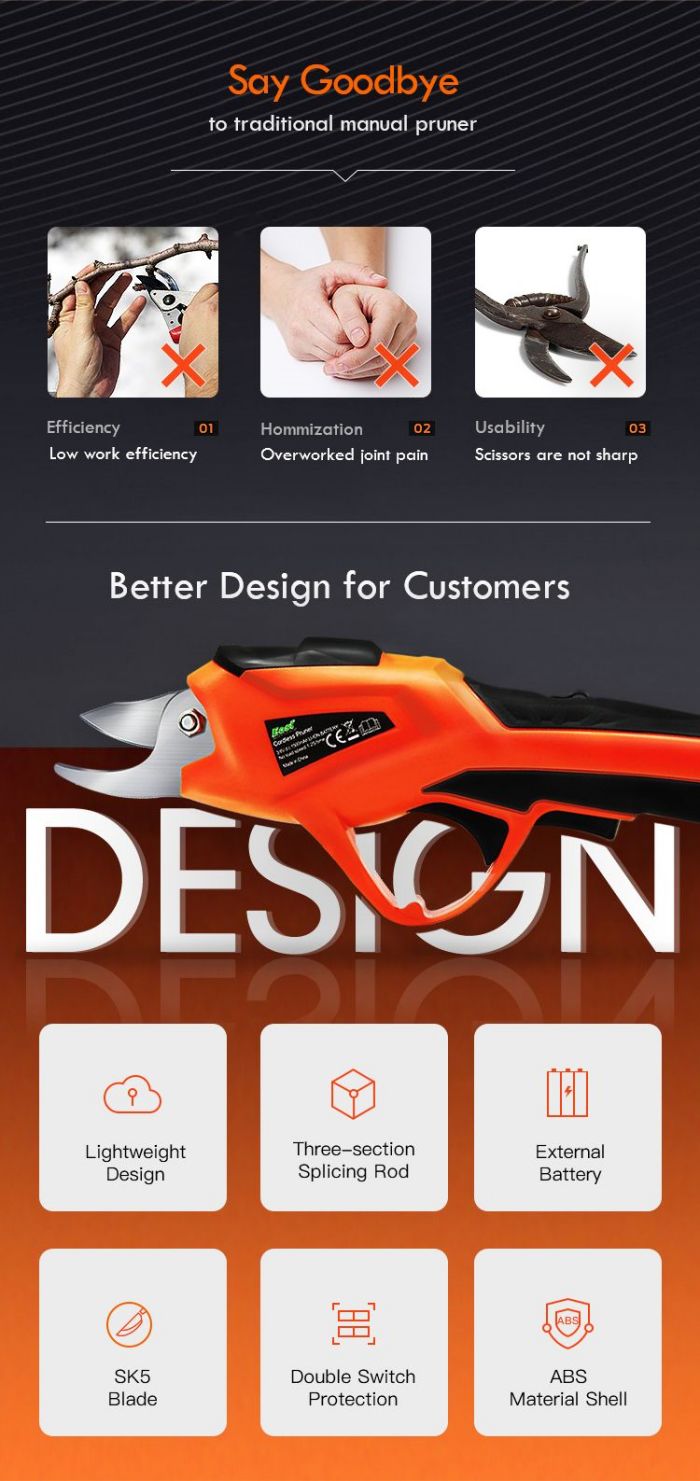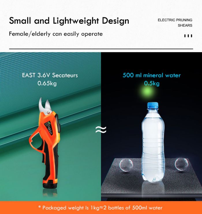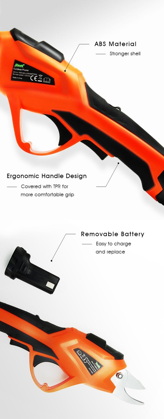 ●【Light Weight & Eco-friendly Job】This electric cordless pruner only 3.3 pounds, single hand can handle very well, it’s also easy for women to operate. Pruner is no cord, no gas, no oil, make for an eco-friendly job.