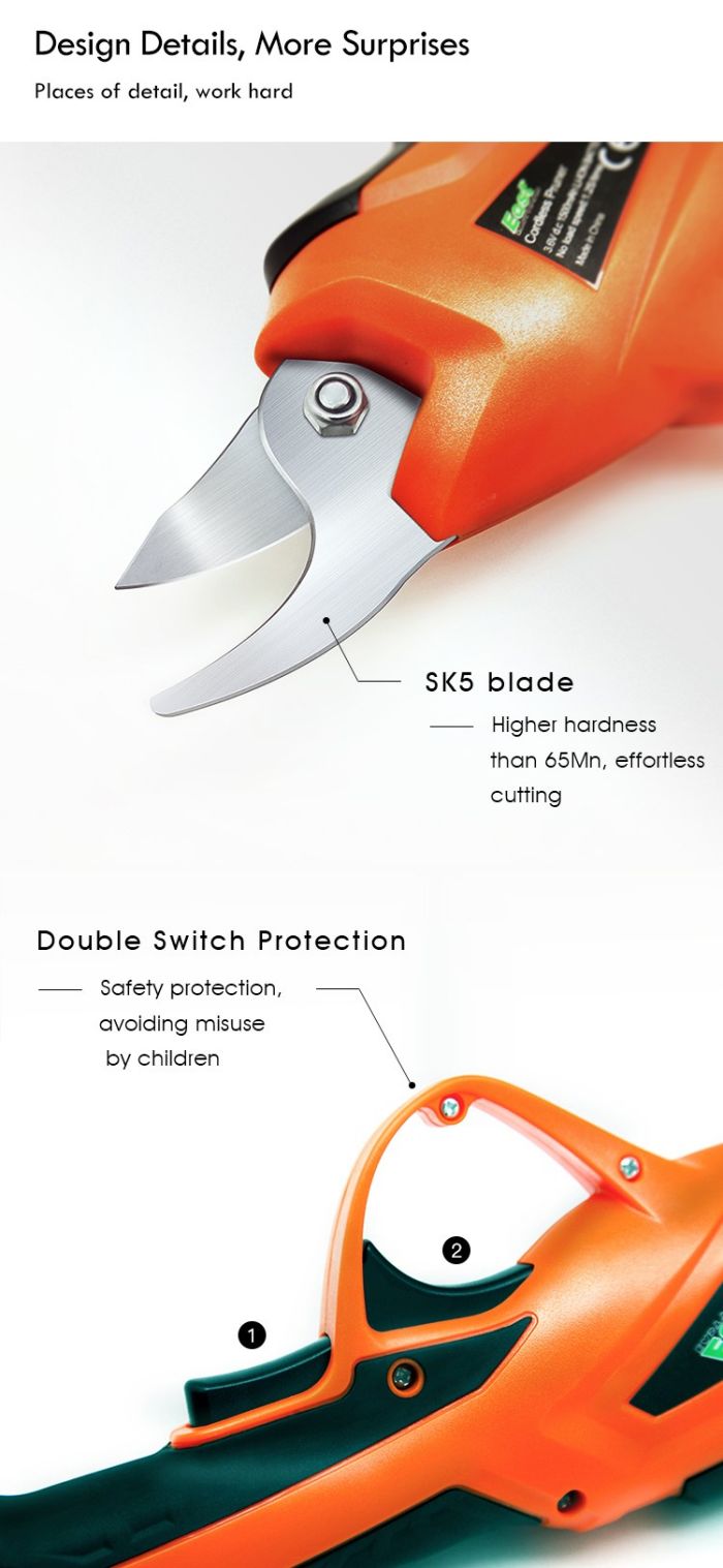 ●【Ergonomic Handheld Design & Double Safety Switches】Ergonomic handheld design reduces fatigue, allow for less stress on your hands. The electric pruners for gardening with double safety switches, you must press both two switches, machine can be to work.