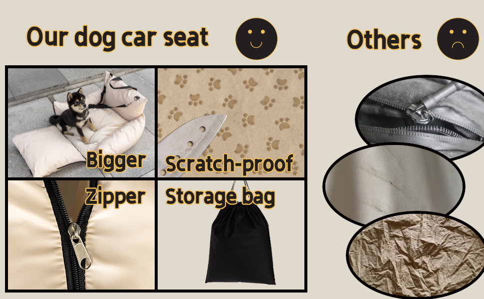 Warm Durable Material - Our dog car carrier is filled with great PP cotton, more thick and soft than others, and the surface is high-quality and delicate fluff, which provides a comfortable sleeping surface for the dog and also protects the dog’s joints! The exterior uses waterproof Oxford cloth, the stitching is very firm, and it is durable, waterproof and scratch resistant!
