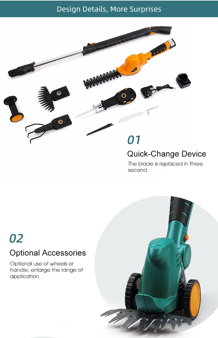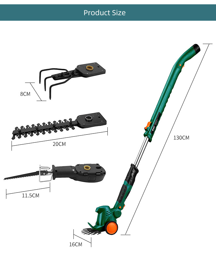 | Tillbehör | Häcksax + Gräsklippare + Kultivator + Tigersåg |